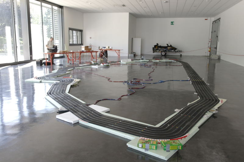 A questo punto, tre alternative possibili: rimandare tutto, usare solo 4 corsie per la gara, cercare un altro PC. Ho optato per quest’ultima soluzione e ringrazio ancora il mio amico Riccardo che mi ha prestato il suo vecchio portatile con la parallela. Ho provato venerdì sera i tratti interrotti e i 2 PC con un rettilineo di circa due metri e tutto funzionava, anche se il PC a prestito si è rivelato molto lento e ha richiesto un lavoro di impostazione che Maurizio ha fatto sabato mattina durante i giri liberi. Lo ringrazio per la collaborazione.