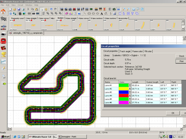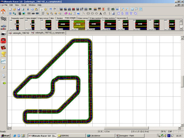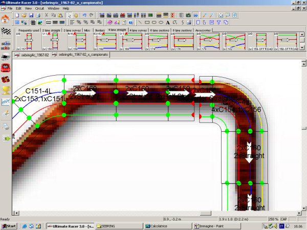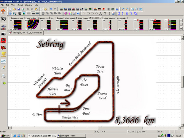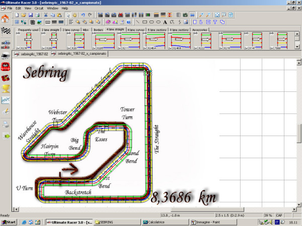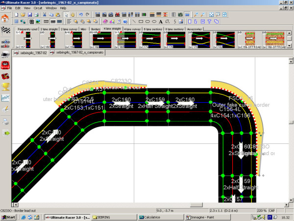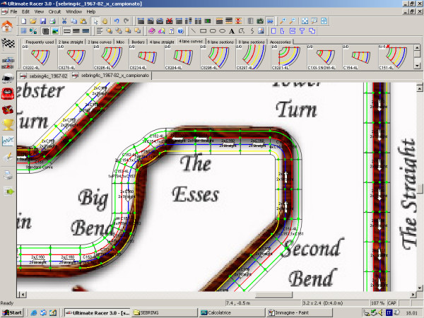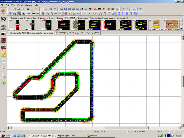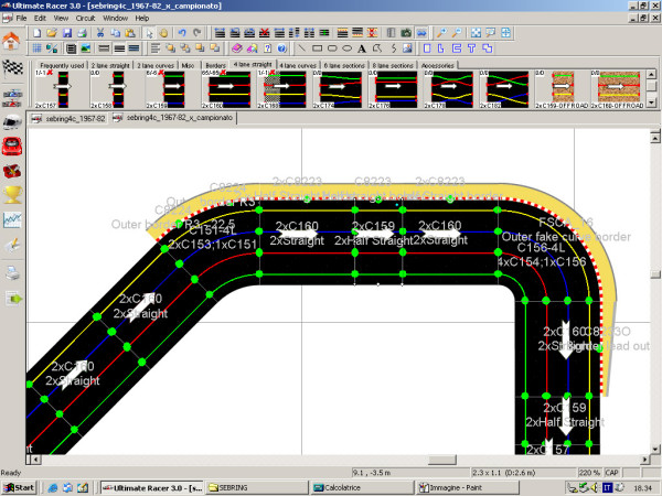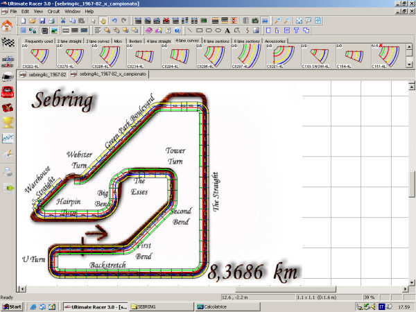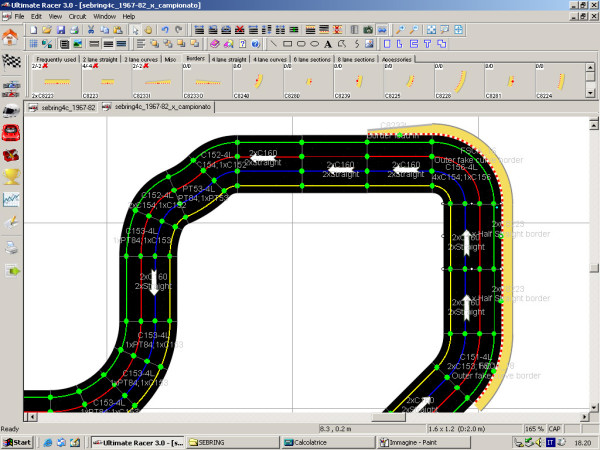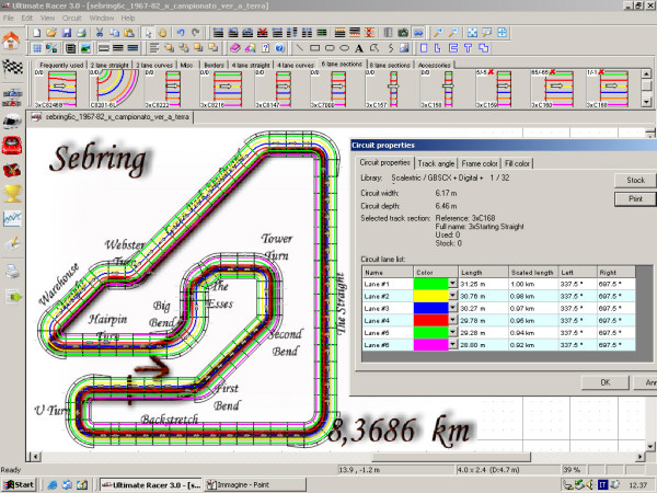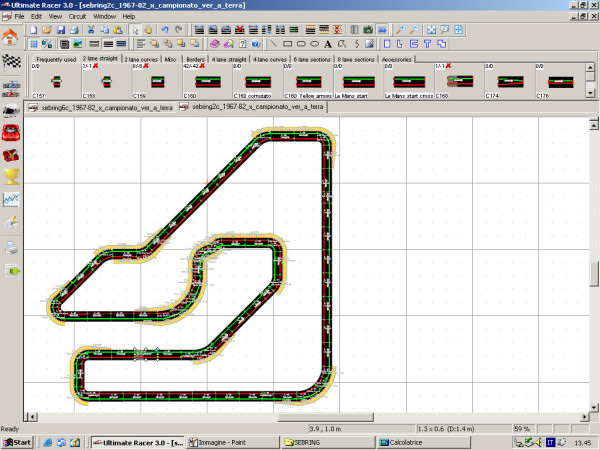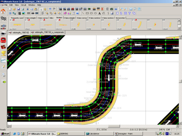 Ecco come appare la versione a sei corsie di Sebring, rispettivamente per la progettazione del circuito versione sollevata e versione a terra, complete di cordoli e con uno sviluppo di circa 30m al centro (scala 1:280):